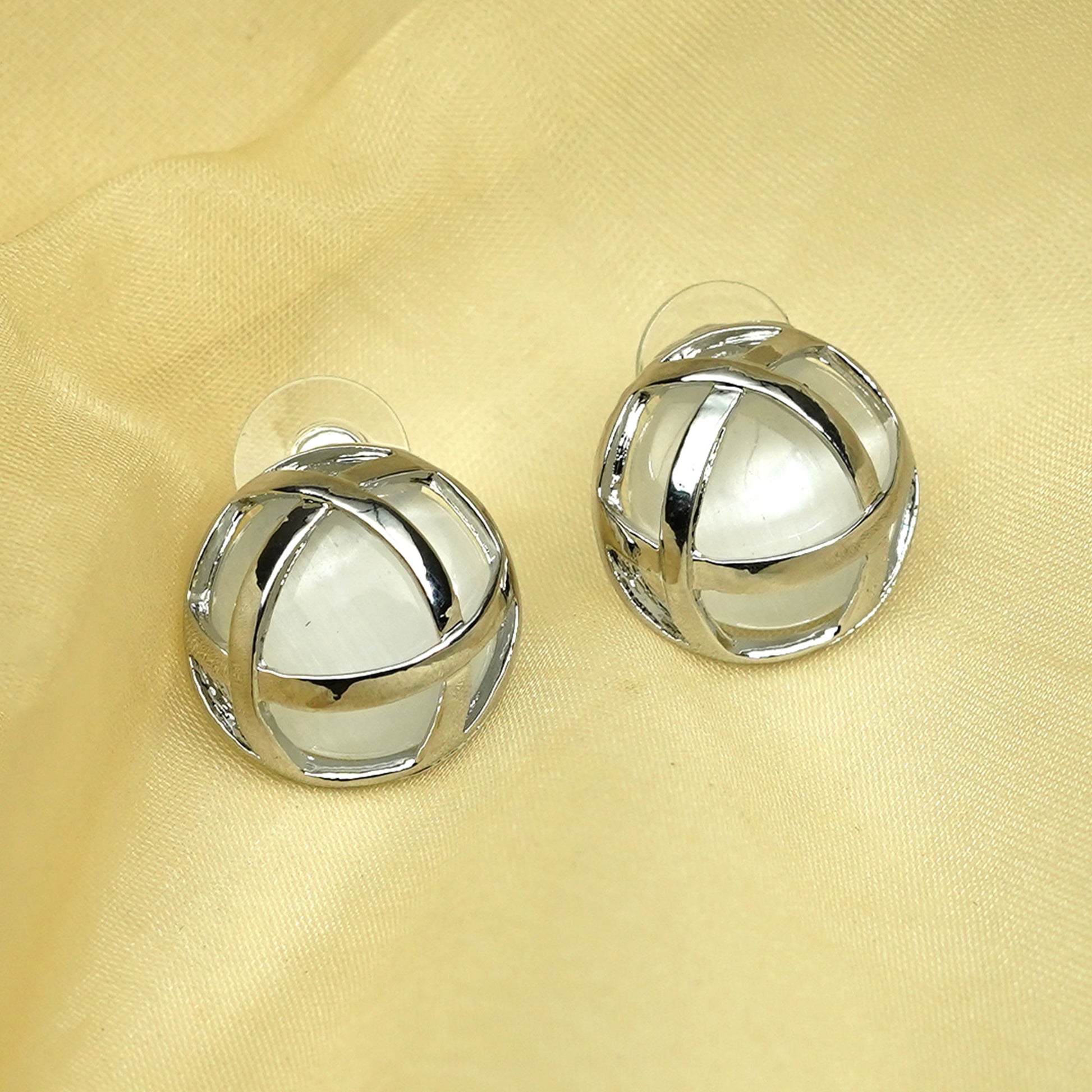 These silver tone dome-shaped stud earrings feature a modern criss-cross design with a white pearl-textured center. A bold and premium pair for women & girls for parties look and special occasions.