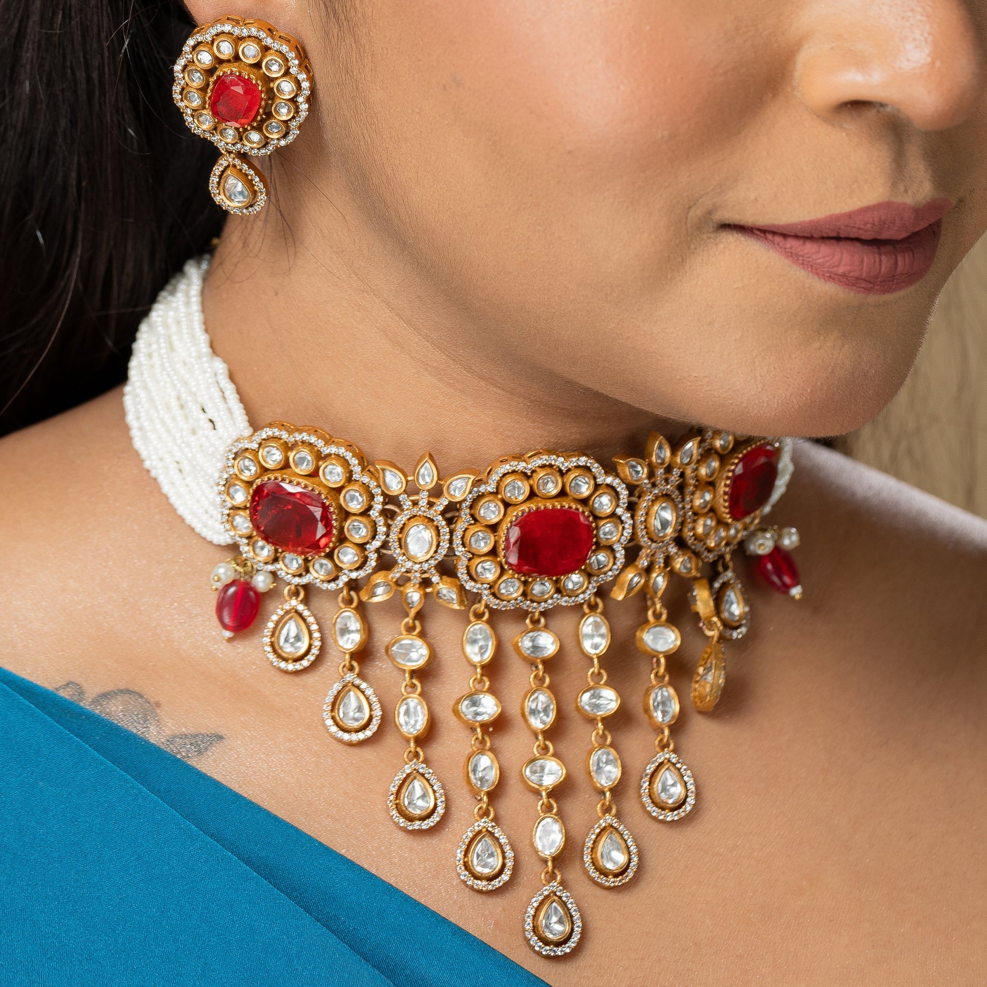 Make a dazzling statement with the Zevar Club Glamorous Glitzy Red Choker, adorned with red kundan and fine pearls in 18K gold plating. This choker exudes opulence and glamour, perfect for grand celebrations and festive occasions. The intricate craftsmanship and shimmering details ensure all eyes are on you, making it a standout piece in your jewelry collection. Shine bright with this glamorous choker that combines traditional elegance with contemporary flair.